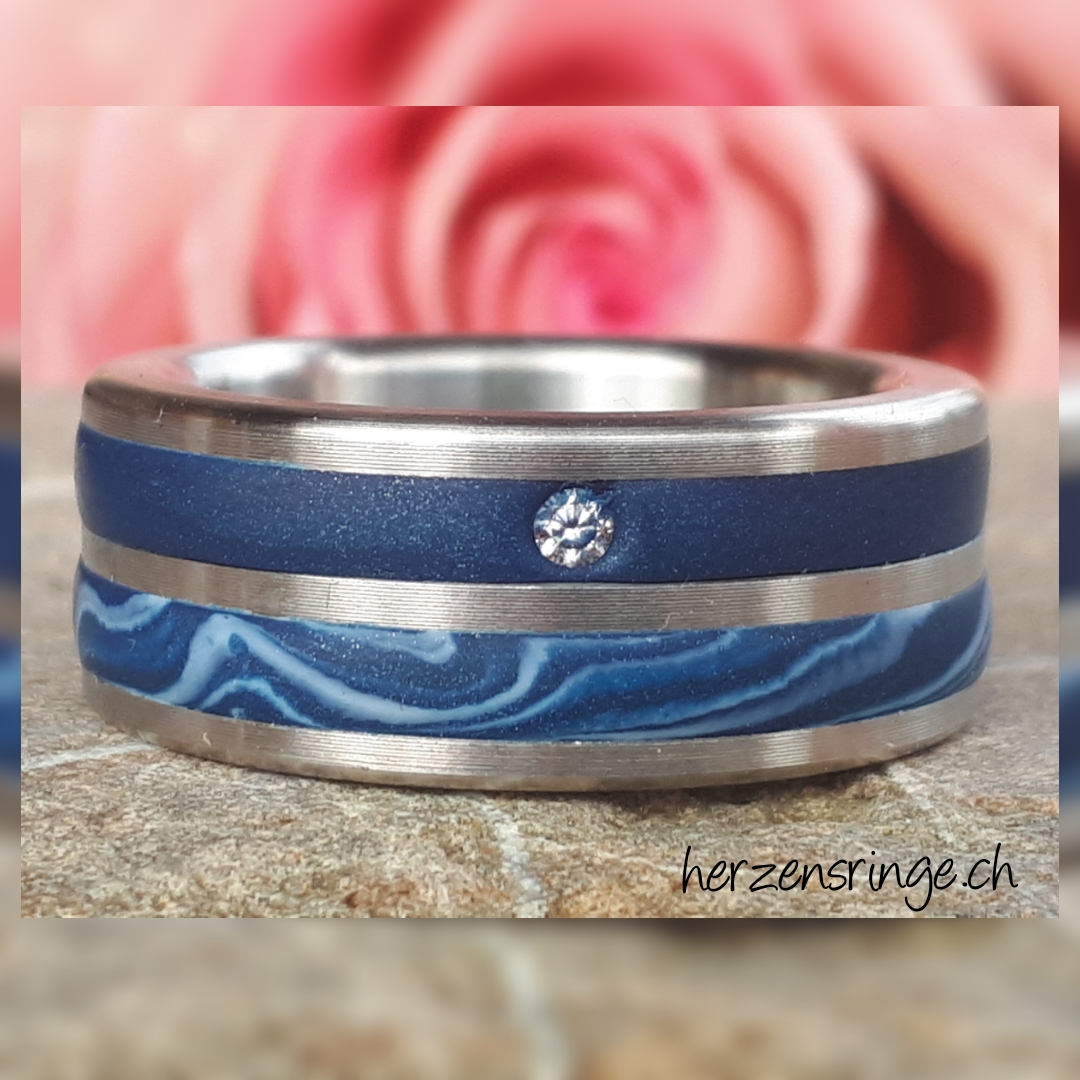 Für die erste Rille: Wähle deine Grundfarbe (z. Bsp. Nachtblau) inkl. eventuellem Schmuckstein. In der zweiten Rille: Wähle Schwarz oder Perlmutt für die Marmorierung (z. Bsp. Nachtblau und Perlmutt).